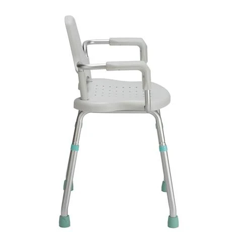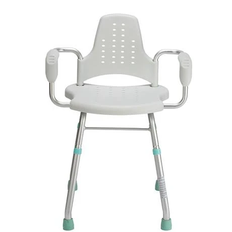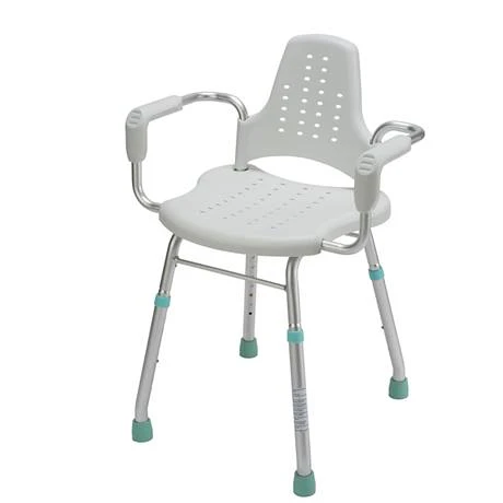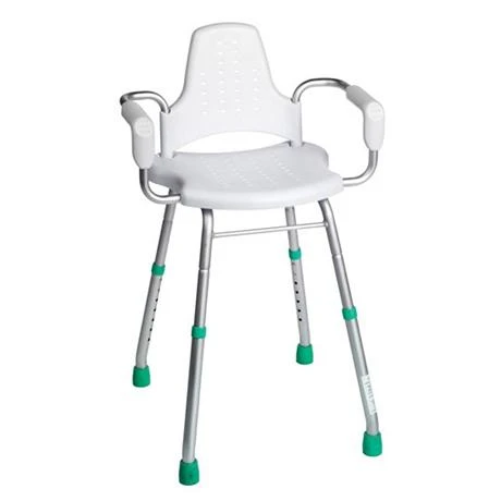 - Sturdy but lightweight shower seat with arms and backrest