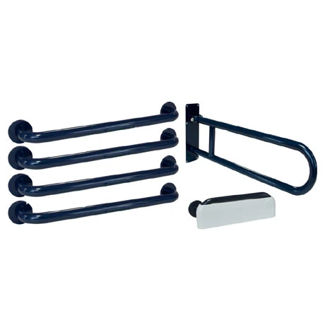 A set of DOC M grab rails constructed from epoxy coated aluminium in blue (Ral 5011) finish. Each rail has a diameter of 35mm and features concealed fixings. The set consists of 1 x 760mm drop down rail, 4 x 600mm straight grab rails and 1 x 250mm deep backrest. The hinged arm locks in the upright position when not required.