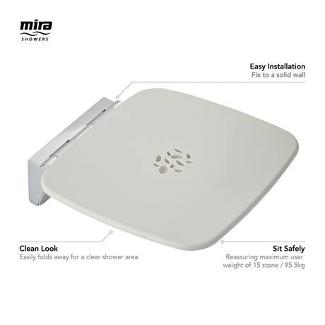 Comfortable and stylish with a slim-line design, the fold-away Mira Premium Shower Seat can be used in or out of the showering area. Features drain holes for maximum comfort.